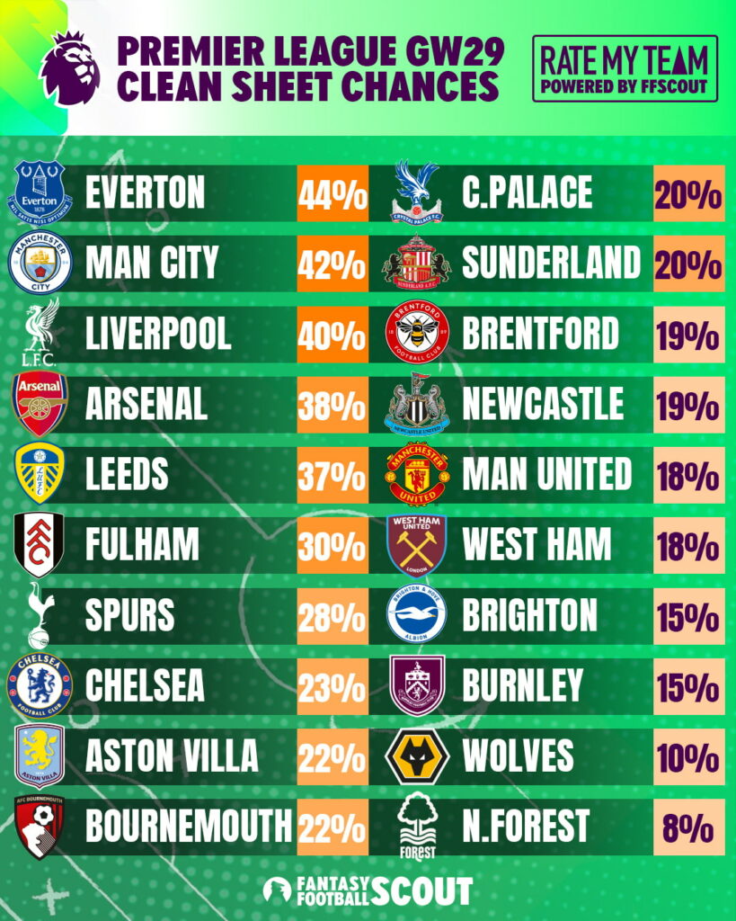 GAMEWEEK 29 CLEAN SHEET PROJECTIONS