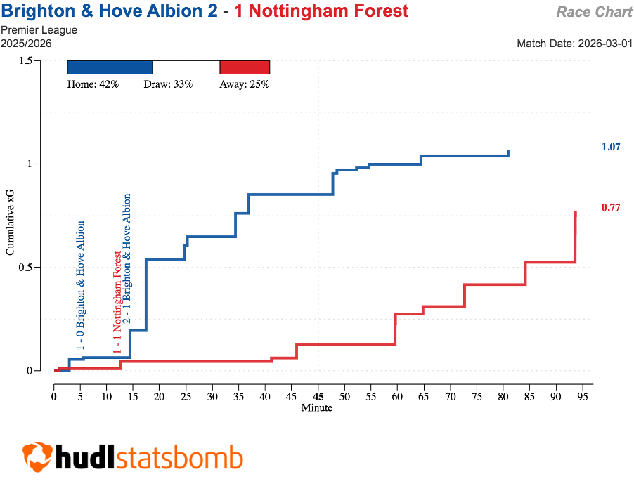 However, Forest generated just 0.77 expected goals (xG) on Sunday, with chance creation a major problem for them throughout the season.