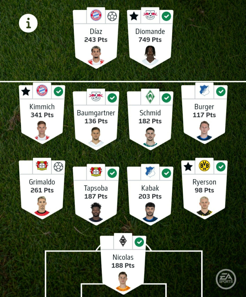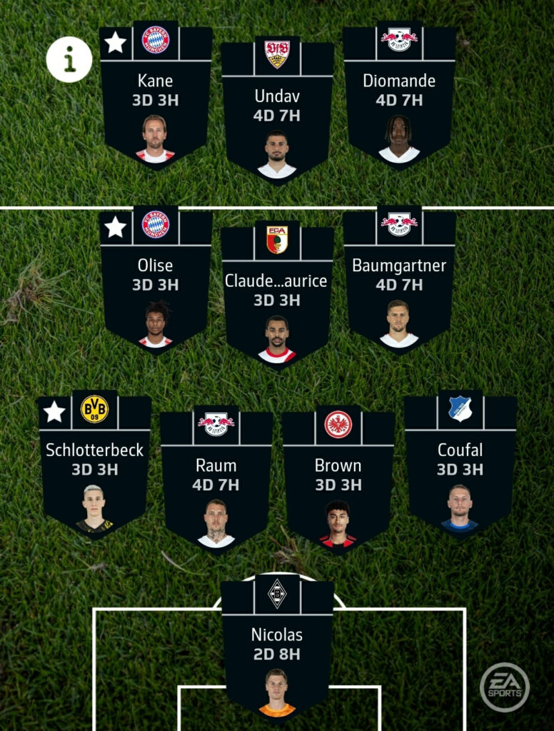 - Forwards: Harry Kane, Deniz Undav & Yan Diomande – Kane should be back for Bayern this weekend, so he returns straight to my team as well. However, Luis Díaz could be benched, which might force me into a transfer there. Undav remains in red-hot form, so it could finally be time to bring him in. Alternatively, I might take a punt on a Frankfurt forward such as Jonathan Burkardt or Jean-Matteo Bahoya.