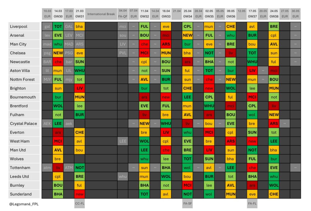 Those postponed fixtures can’t move to the subsequent midweek if at least one of the teams involved is still in Europe. They’d instead be shifted to free midweeks after Gameweek 33/Gameweek 36 (probably the former), creating a ‘double’.