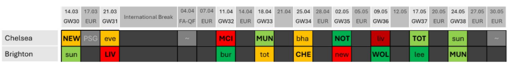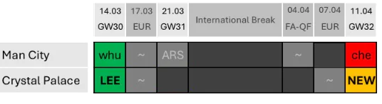 - Manchester City and Crystal Palace will still probably (not yet definitely) blank in Gameweek 31. City and Palace to have 1-2 doubles thereafter, one likely to be in Gameweek 33.