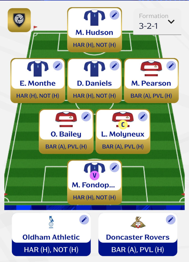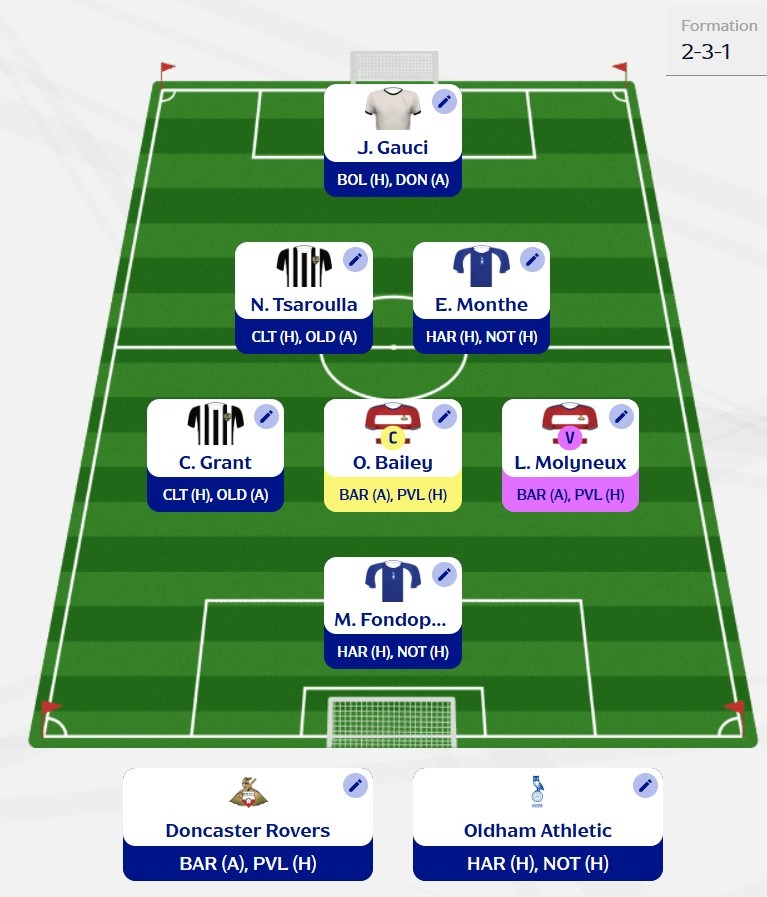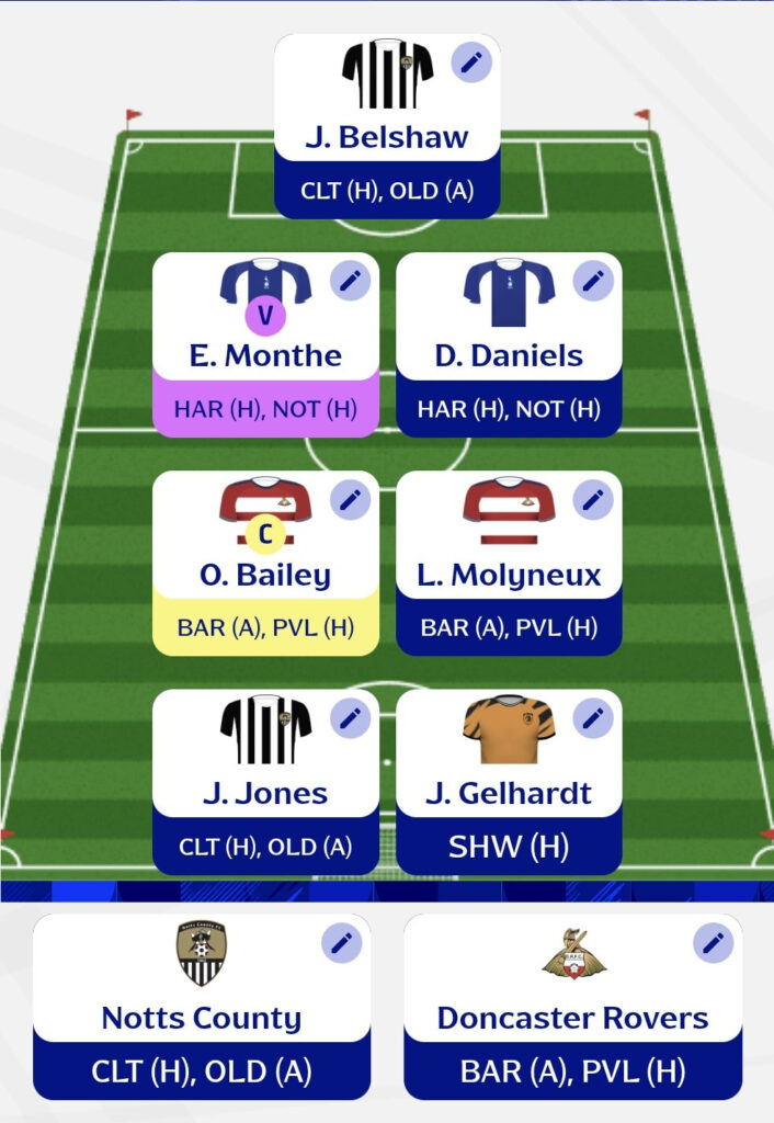 - The remaining spots will be filled by Doncaster players. Owen Bailey and Molyneux feel like locks given their consistency, especially with the lack of strong midfield options elsewhere. I’ve also gone for Mathew Pearson, whose bonus potential has looked very strong recently. I can see a clean sheet in that second game, although this may still change.