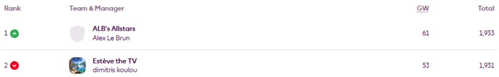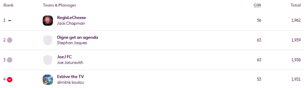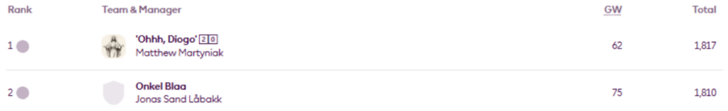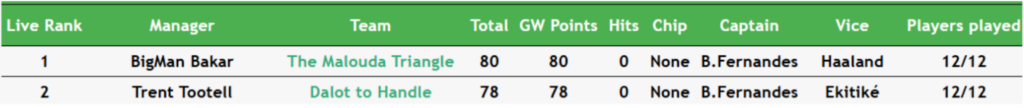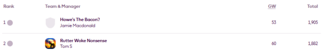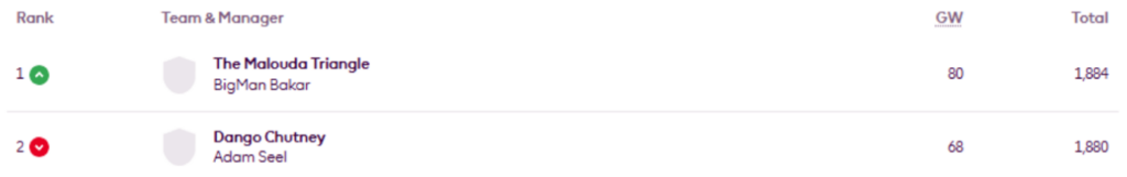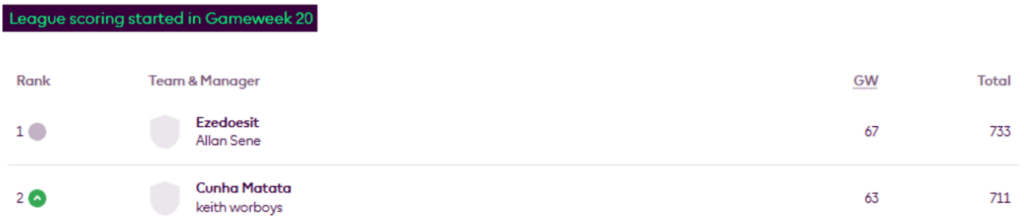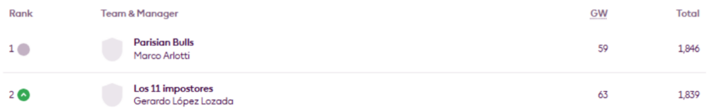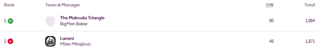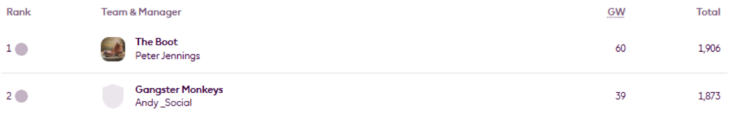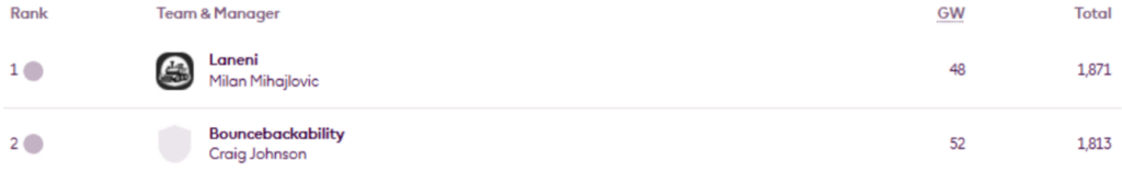 BigMan Bakar once more. He’s regained the lead in Livinginapool’s Top 100 Any Season mini-league (code 5xdeje) too, having previously led between Gameweeks 17 and 27.