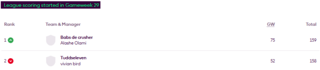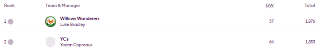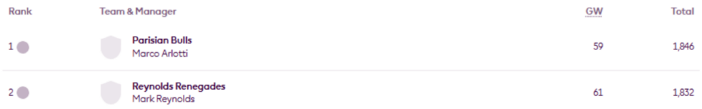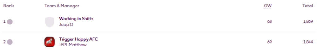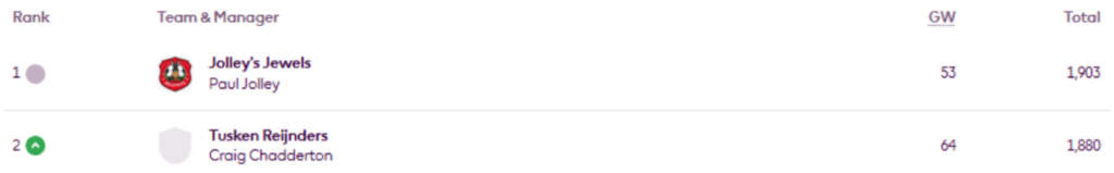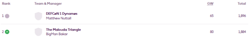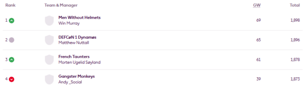 MIR’s FFS Head-to-Head Leagues were updated on Wednesday evening and now show the positions after Gameweek 30.