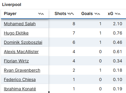 Front two Salah and Ekitike registered a massive 15 shots between them, with the Egyptian especially spurning some good chances.