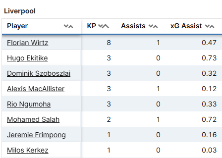| Liverpool | 4 | Alisson (90), Van Dijk (90), Szoboszlai (90), Mac Allister (90), Wirtz (89), Gravenberch (89), Frimpong (67) | Konate (90), Kerkez (90), Ekitike (89), Salah (74), Jones (23), Gakpo (16), Nyoni (1), Chiesa (1), Ngumoha (1) |