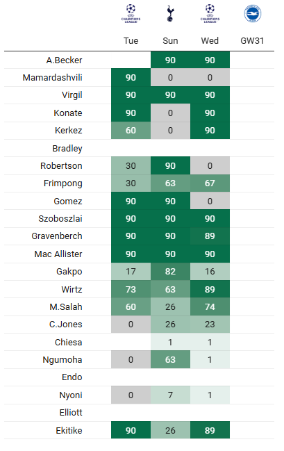 So, a niggle before one of the quickest turnarounds of the season: 63 hours between his substitution in midweek and kick-off at the Amex on Saturday. Arne Slot will hopefully provide us with another update on Friday but if it’s anything more than mere cramp, he represents a significant early doubt for Gameweek 31.