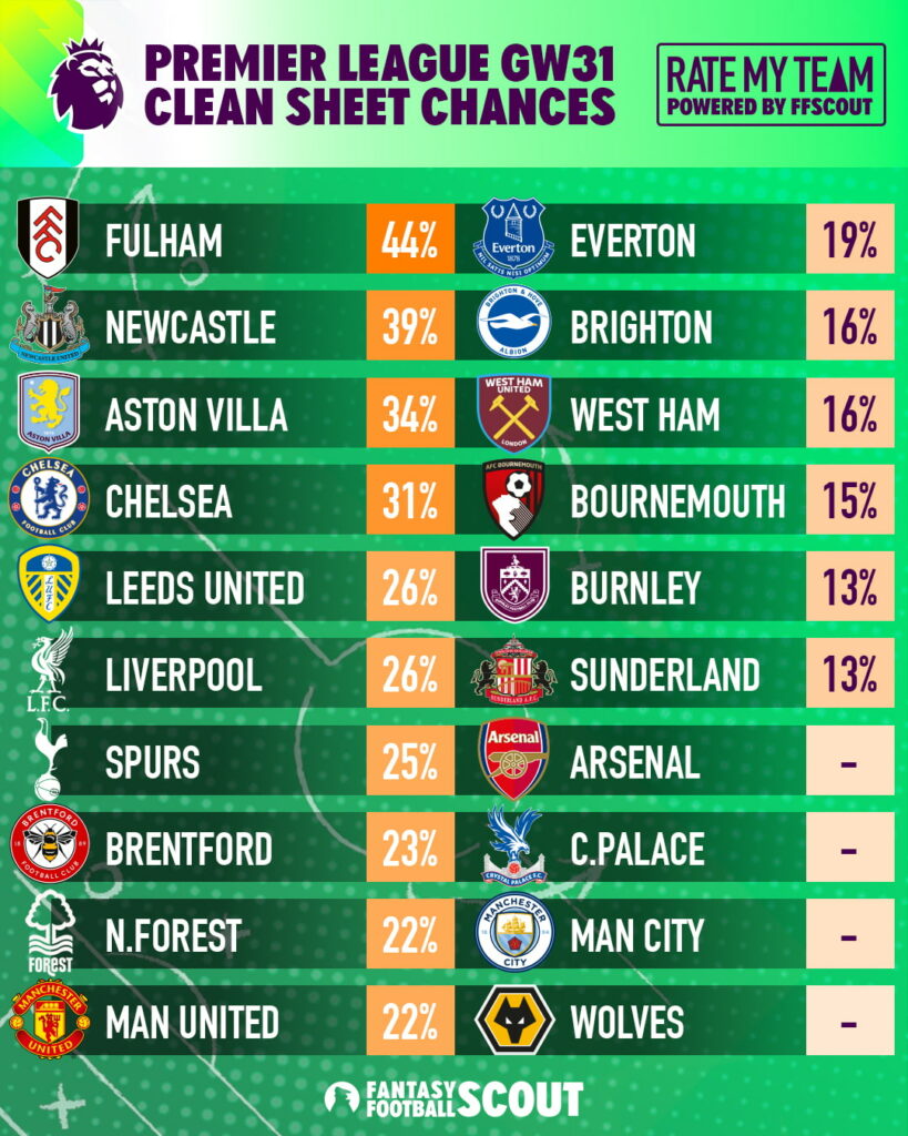 GAMEWEEK 31 CLEAN SHEET PROJECTIONS