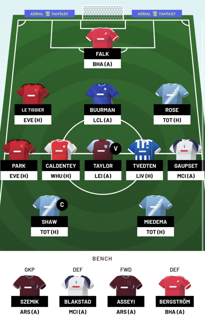 Manchester City were disappointing in attack last weekend, drawing a blank against Aston Villa. Despite that, I’m keeping faith in Khadija Shaw as captain, having scored a hat-trick in each of her last three home matches against Tottenham.