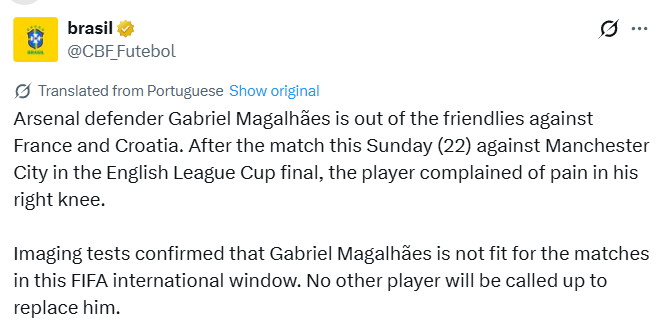 Later in the day, the Brazilian FA confirmed that Gabriel was set to miss out this international fortnight.