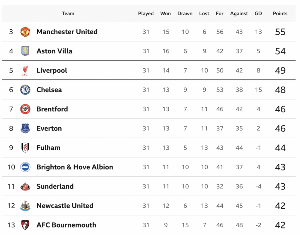 So, with Arsenal and Man City in the title race, Manchester United, Aston Villa, Liverpool and Chelsea are the other main teams aiming for Champions League qualification.