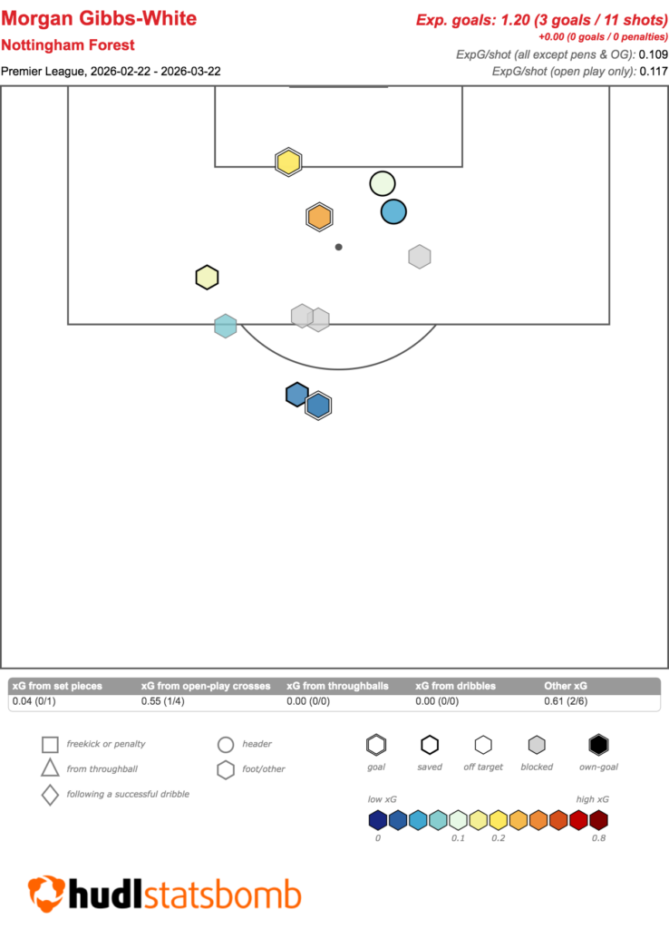 Encouragingly, the appointment of Vitor Pereira hasn’t impacted those numbers, with Gibbs-White’s shot map in Gameweeks 27-31 captured below.