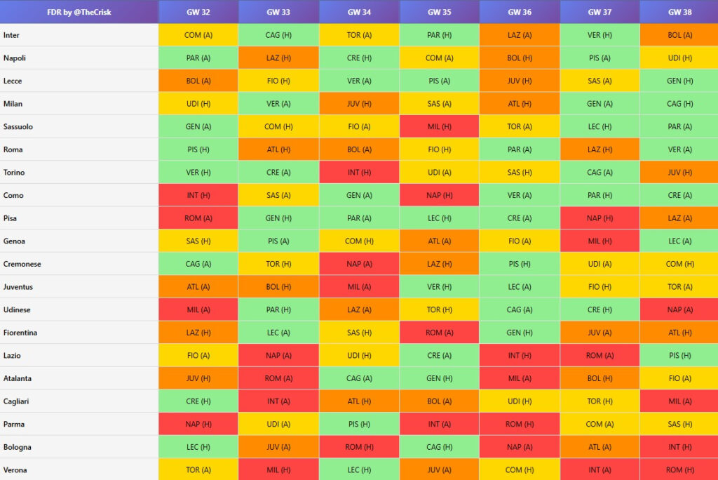 On the other hand, several teams face a tougher run. Verona, Bologna, Parma and Lazio all have three difficult fixtures before Gameweek 38. That makes them less appealing for investment. Avoiding these sides could be key for fantasy managers.