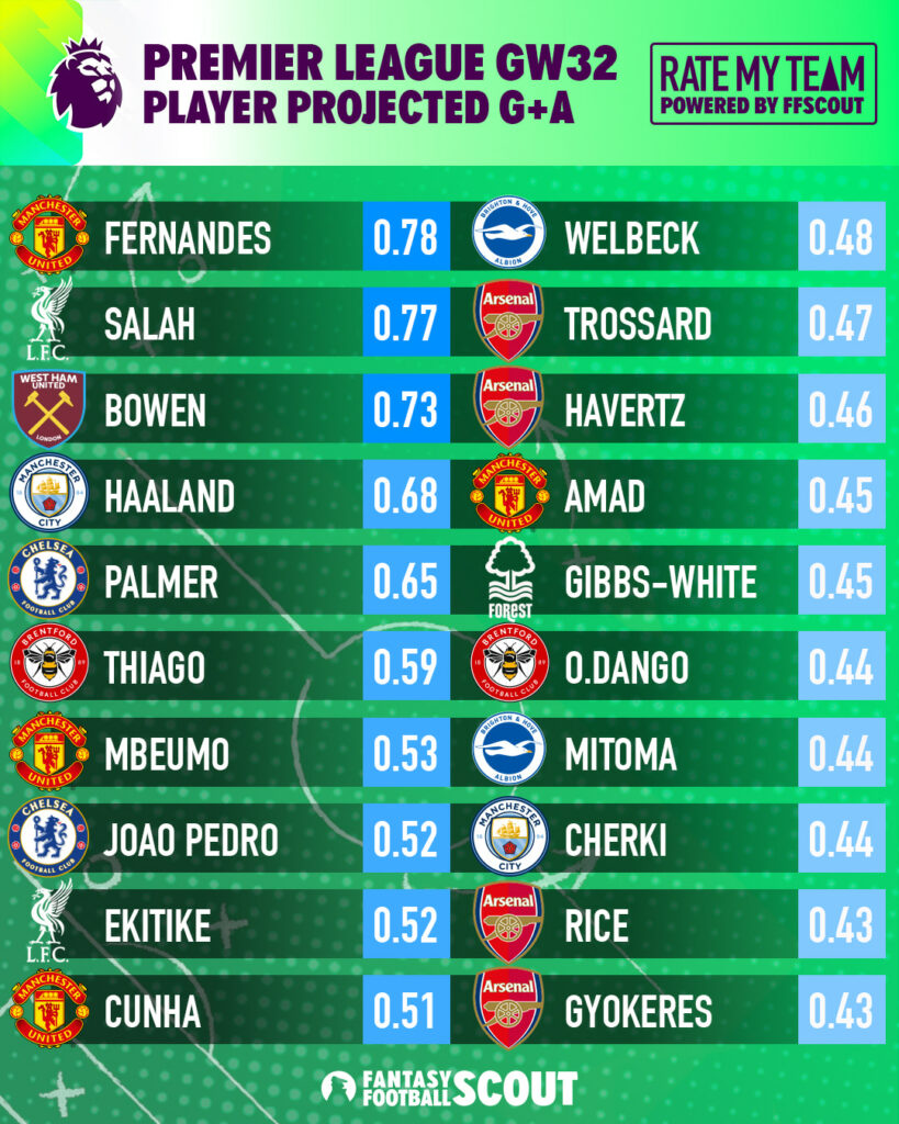 Looking for the players with the best chances of attacking returns in Gameweek 32? We’ve broken down the latest Rate My Team (RMT) projections to reveal which players are most likely to score or assist this week.