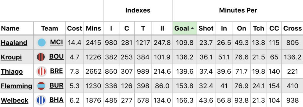 Above: Forwards sorted by minutes per goal in 2025/26 (minimum 200 mins played)
