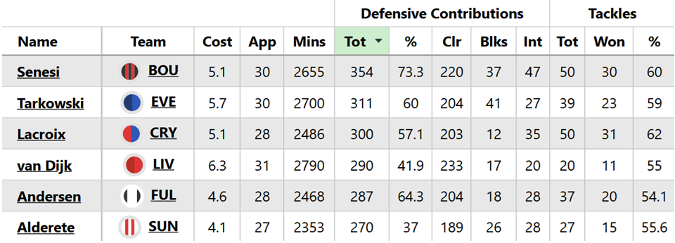 Alex Scott (£5.0m), now pretty much nailed in the Bournemouth midfield, is an interesting shout. He’s third among midfielders for defensive contributions (at a success rate of 63.6%) since Gameweek 21, when his series of 90-minute appearances started.