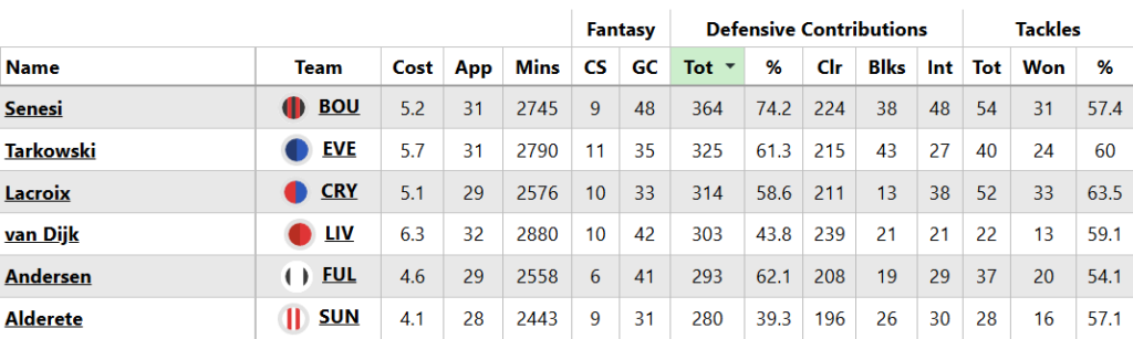 Speaking of DefCon, Marcos Senesi (£5.1m) will require little introduction to most FPL managers this term. The Bournemouth centre-back boasts a league-high tally of such actions among defenders, and the highest success rate in the metric of all players (74.2%), on top of four assists.
