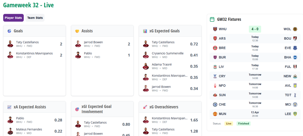 Here you can follow the scores, watch the defensive contribution (DefCon) points roll in, see who the leading players are for xG and more as the games play out, as seen below: