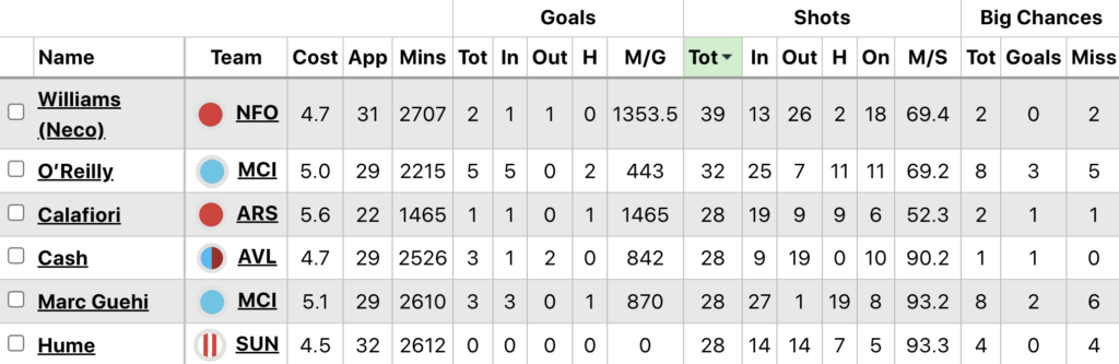 Above: Defenders sorted by shots (Tot) in 2025/26