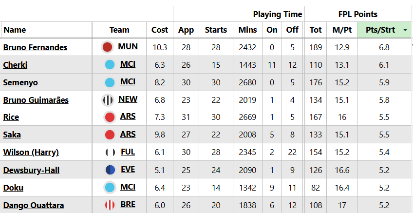 Above: The 10 leading midfielders for points per start (min. 10 starts)