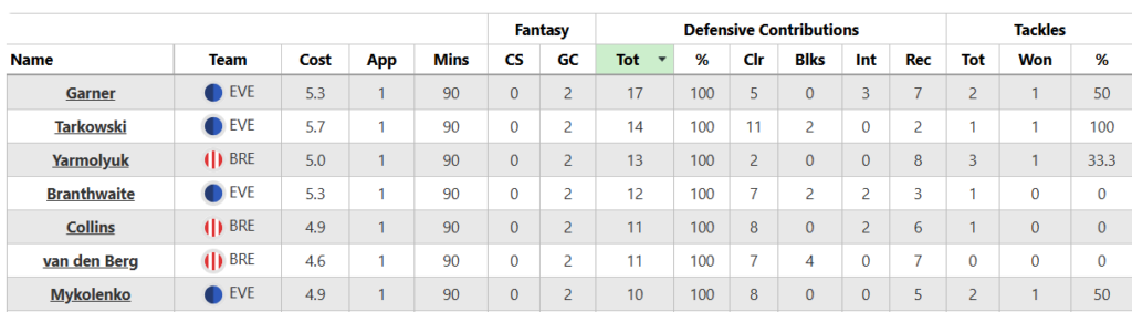 James Tarkowski (£5.7m) and Garner fittingly topped the list; they’re both second for DefCon points among FPL players in their position this season.