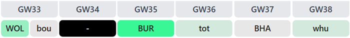 The nature of FPL means that Noah Okafor‘s brace will make him a popular differential for Gameweek 33 Free Hit users. The Swiss international has four goals in his last four appearances. But be aware that his game-time may continue to be carefully managed by Farke, so if you’re after 180 minutes or two guaranteed starts, he might be a ‘pass’.