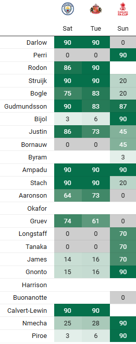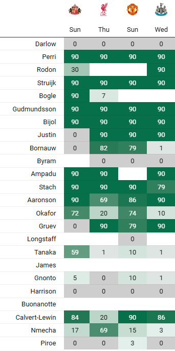 Above: Leeds’ minutes in their last three-game week, via our Minutes Tracker (a white block means not in the squad)