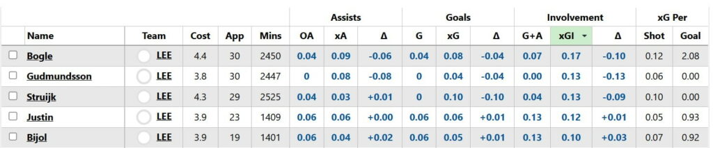 Jayden Bogle (£4.4m) has the highest expected goal involvement (xGI) per 90 rate amongst their backline, showing he’s capable of a goal or an assist.