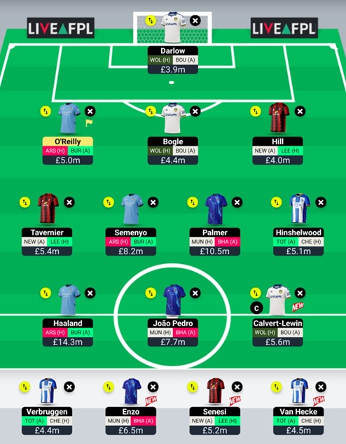 Erling Haaland (£14.4m), Joao Pedro (£7.7m), Cole Palmer (£10.5m) and Marcus Tavernier (£5.4m) pick themselves, in my opinion, due to their sheer ‘quality’ and two – possibly three – of them are on penalties.