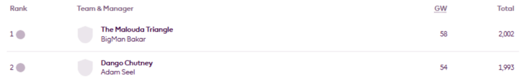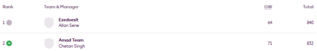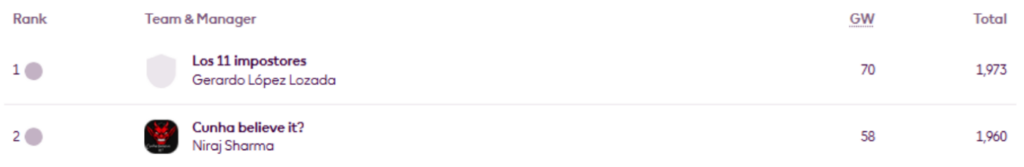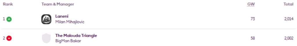 BigMan Bakar is another who used a Wildcard. He leads Livinginapool’s Top 100 Any Season mini-league (code 5xdeje) for a third successive week and fifth time this season. He is now 1,557th overall.