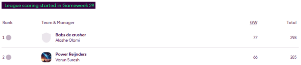 He has also grabbed the lead in PDM’s Top 1k Any season mini-league (code rcxj6b), having led between Gameweeks 27 to 29.