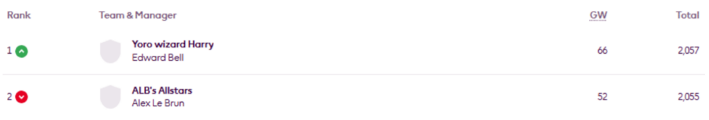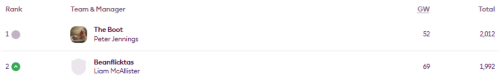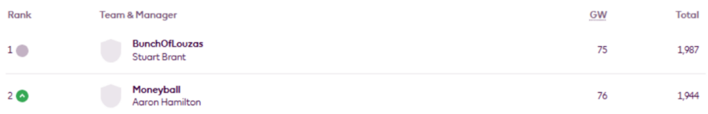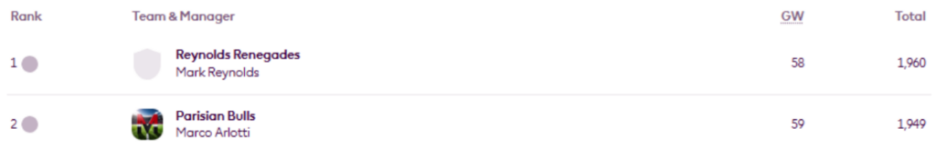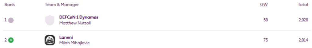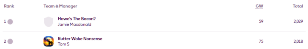 Matthias99th (now 2,216th) had to rely on his superior rank to go through after a 57-57 draw with oscardude1. He’s been overtaken as round three’s highest-ranked manager by Berries (Joe Kelleher. Now 2,159th, he’s had five top 10k finishes.