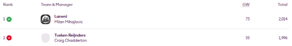 Time for some more Milan Mihajlovic, now. He’s in first place of Skooldaze’s FPL Vets 2006 or before mini-league for an 11th consecutive week and 18th time this season.