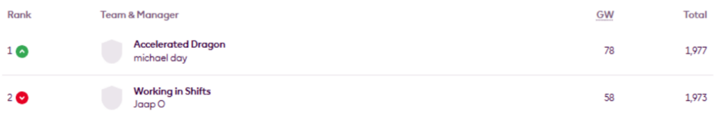 Thanks to activating a Bench Boost, Michael Day now sets the pace in Chabs’ Multiple Top 1k Finishes mini-league (code abwcxs), having previously led after Gameweeks 8 to 11. He has risen to 5,949th overall.