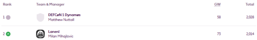 Having just Wildcarded, Matthew Nuttall leads my Top 10k Any Season mini-league (code 6axmwm) for a second successive week and fifth time this campaign. He’s 394th overall.