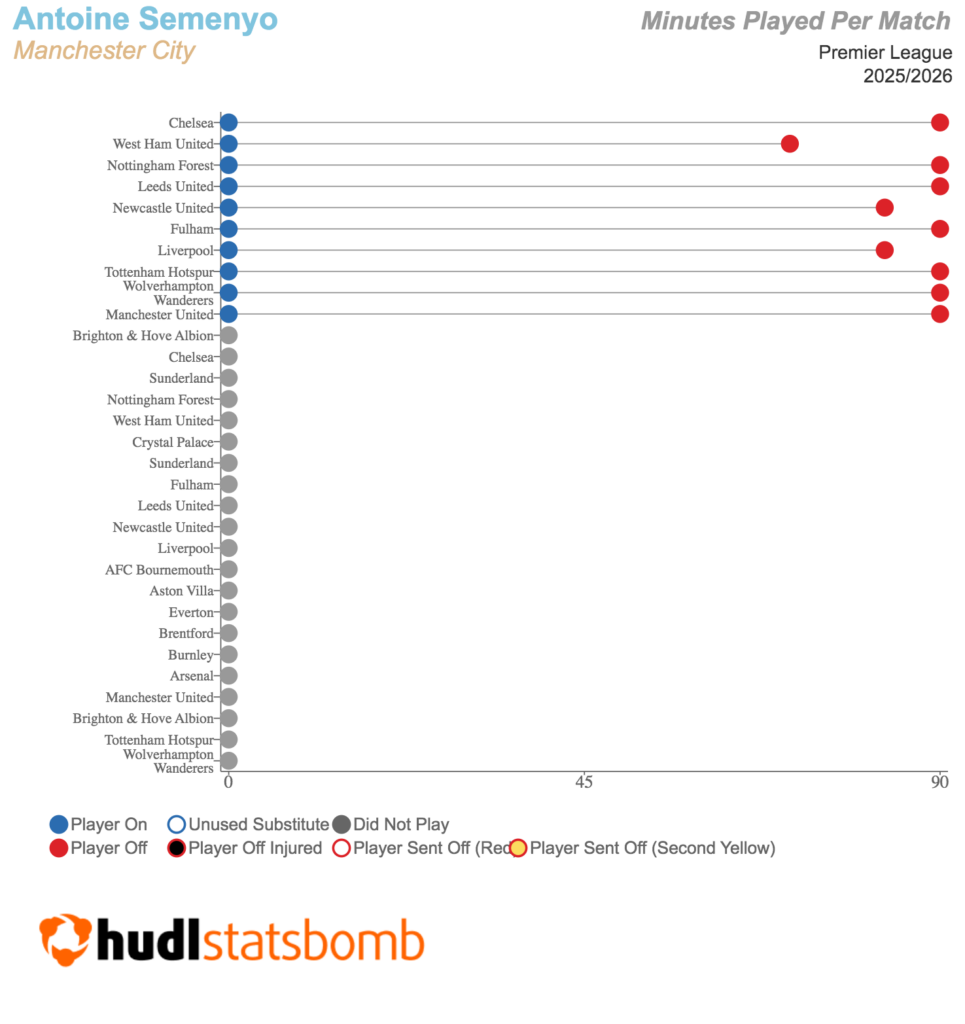 Elsewhere, Antoine Semenyo (£8.2m) has served up 56 points since his City debut, thanks to five goals and one assist in 10 matches. He’s arguably the safest route into City’s midfield, too, having been a starter in all 10 of those games, averaging 88.0 minutes per appearance:
