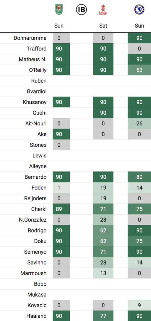 Using the handy new Minutes Tracker tool in our Members Area, you can check out the minutes played by each of City’s players across all competitions in a certain time period; for example, their last three fixtures, as below:
