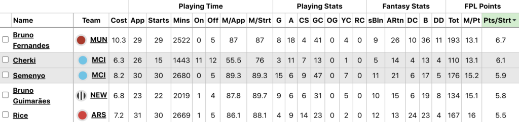Above: FPL midfielders sorted by points per start (Pts/Strt) in 2025/26 (minimum 1,000 minutes played)