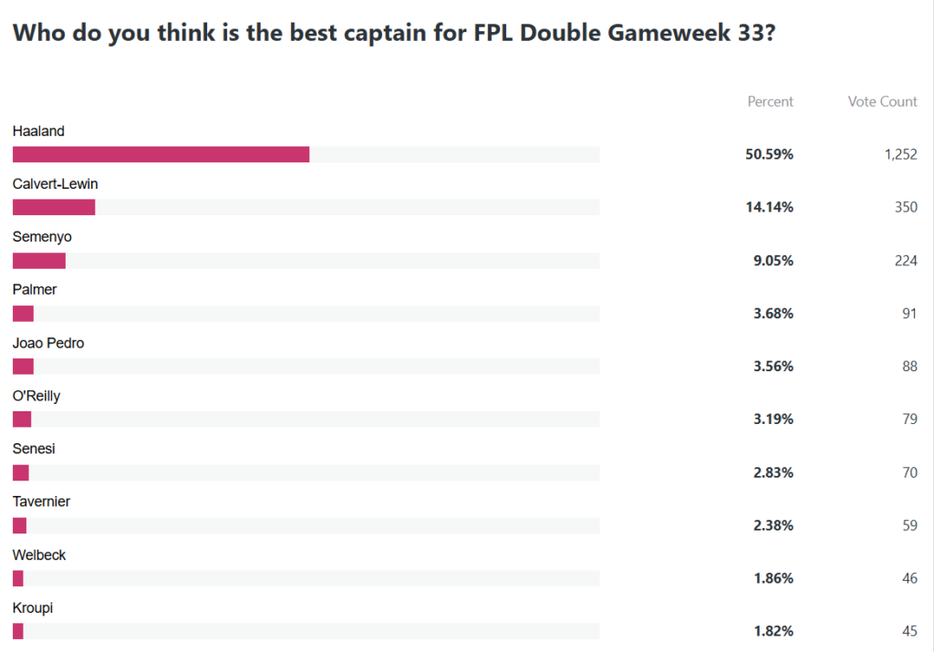In something of a throwback, Haaland boasts a clear lead in the Fantasy Football Scout captaincy poll. The Man City striker has picked up over 50% of votes cast ahead of matches against Arsenal and Burnley in the Double Gameweek.