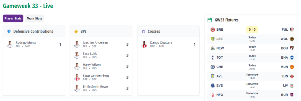 Here you can follow the scores, watch the defensive contribution (DefCon) points roll in, see who the leading players are for xG and more as the games play out, as seen below: