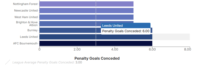 One thing worth mentioning is that Leeds and Bournemouth, who meet next Wednesday, are both bottom for penalty goals conceded (six each) in 2025/26. Newcastle are just one behind: