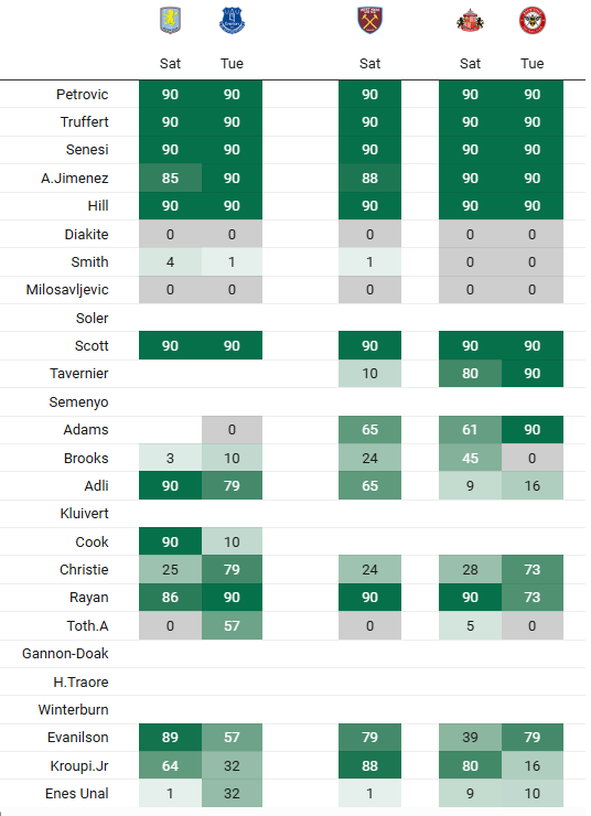 Above: Bournemouth’s minutes in their last two weekend/midweek turnarounds, via our Minutes Tracker (a white block means not in the squad)