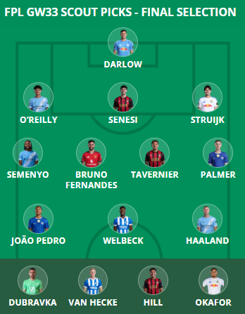 Squads should mix these budget-friendly names with bigger ones like Erling Haaland (£14.5m), Cole Palmer (£10.5m), Antoine Semenyo (£8.2m) and Joao Pedro (£7.7m). All four are unanimous Scout Squad picks.