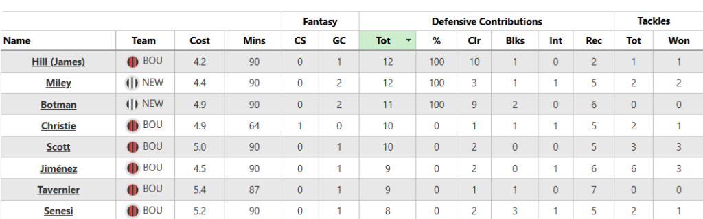 The Newcastle goal aside, James Hill (£4.2m) was imperious at the back again. He was the only Cherry to bank DefCon points on Saturday (see above).
