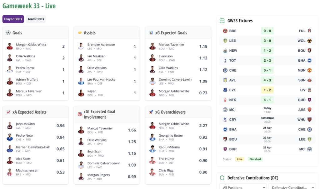 Here you can follow the scores, watch the defensive contribution (DefCon) points roll in, see who the leading players are for xG and more as the games play out, as seen below: