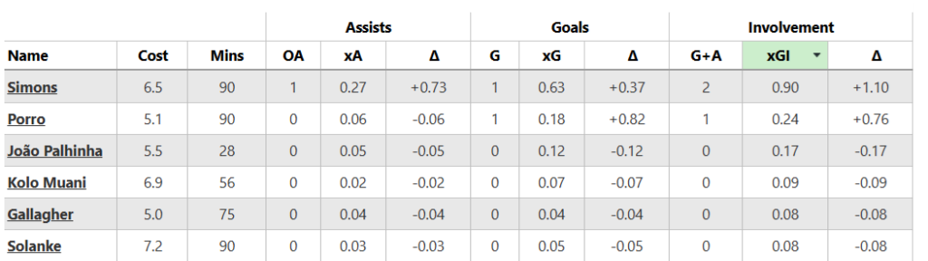 Yankuba Minteh‘s (£5.5m) expected minutes could be about to get a shot in the arm as a result of Gomez’s absence. No surprise that, with his two fellow wingers exiting, he lasted a full game for the first time in 2026.