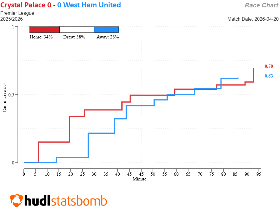 Neither the Eagles nor West Ham reached double figures for shots (nine each). Nor did either team get anywhere near 1.0 xG: