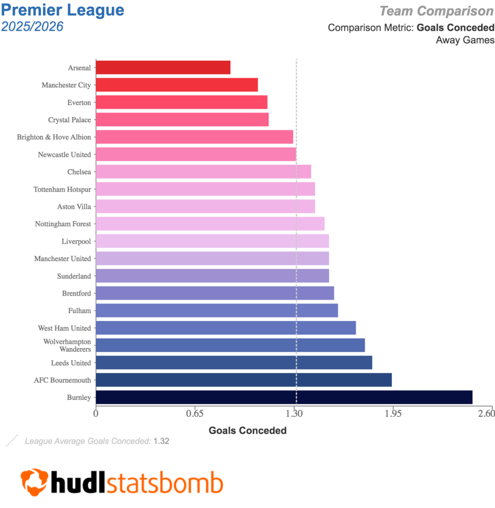 With an approach better suited to playing on the road, as they prefer to operate without the ball, only Arsenal and Man City have conceded fewer goals per 90 (p90) in away matches this season: