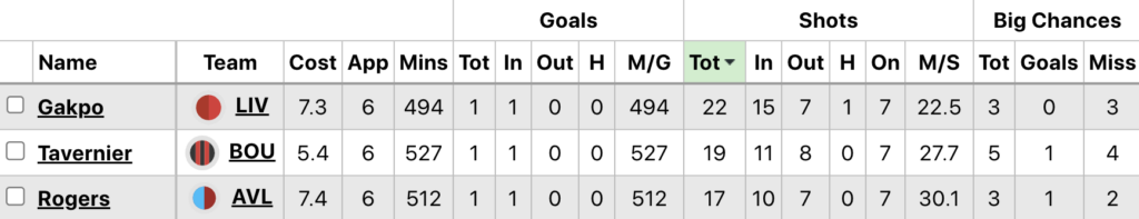 Rogers has some very good underlying statistics in the last six matches, and he’s right up there among all midfielders for both shots and ‘big chances’: