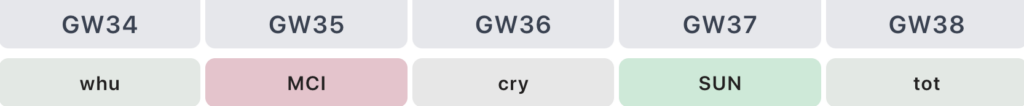 - Sunday 3 May: Gameweek 35 – Spurs (h)